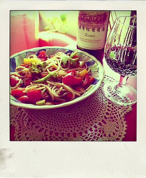 午餐,繼續做著義大利麵,這次佐料加了紅酒,本該搭配牛肉的,結果只有豬肉,反正我做菜也隨性,所以紅酒豬肉義大利麵就誕生了。餐墊是在雪梨的二手雜貨店挖到的寶。